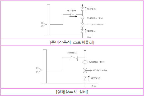 다. 준비작동식스프링클러설비 국내에는 바닥면적이 3,000㎡ 이하로 정하고 있다. NFPA 13 기준 : 이중인터록(Double-interloced)준비작동식스프링클러설비의 경우에 한하여 소화용수 도달시간(델류지 밸브로부터 가장 먼 가지 배관의 끝에 설치된 스프링클러헤드 또는 시험밸브함의 오리피스까지 도달하는 시간)을 배관 내에 배관누설감시용 압축공기가 채워져 있는 정상상태에서 60 초 이내로 제한하고 있으며 위험등급별 소화용수 도달 시간은 건식스프링클 러설비와 동일하게 적용한다. 또한 준비작동식스프링클러설비 중 이중인터록(Double-interloced) 준비작동 식스프링클러설비의 소화용수 도달시간의 계산을 위한 전제조건으로 화재감 지기와 스프링클러헤드가 동시에 동작하는 것으로 가정한다.