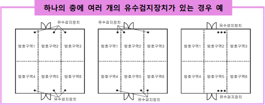 1. 유수검지장치 또는 일제개방밸브의 설치 수량 제1호에서 정한 바닥면적 이하마다 유수검지장치 등을 설치하되, 기술적으로는 다음사항을 고려하여 설치하는 것이 바람직하다. “하나의 방호구역에는 1개 이상의 유수검지장치”를 설치하라는 의미는 방호구역 3,000㎡당 한 개 이상씩 설치하라는 유수검지장치 수량의 기준이며, 방호구역마다 방호구역 내에 유수검지장치를 설치하라는 유수검지장치의 “위치”개념이 아님에 유의해야 한다.