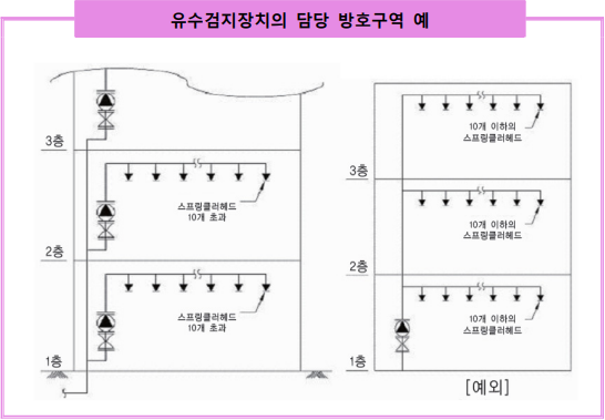 하나의 유수검지장치 등이 담당하는 방호구역 층수의 제한 1개의 유수검지장치가 1개 층의 방호구역을 담당하는 것을 원칙으로 하나 각 층의 바닥면적 합계가 3,000㎡ 이내이며 이에 부설된 층으로서 1개 층마다 설치되 는 스프링클러헤드가 10개 이하인 경우에는 3개 층까지 담당 할 수 있도록 한다. 복층형구조의 아파트는 3개 층까지를 하나의 방호구역으로 할 수 있도록 완화 하였다. 복층형 아파트의 경우 스프링클러헤드는 설치하되 아래층구역과 동일 방호구역으로 설정할 수 있다.