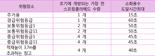 나. 건식스프링클러설비 배관 내에 항상 압축공기가 채워져 있는 건식스프링클러설비의 경우에는 스 프링클러헤드의 개방과 동시에 압축공기가 배관에서 빠져 나간 후에 개방된 스프링클러헤드를 통하여 소화용수가 방출된다. 만일 건식스프링클러설비의 유수검지장치(건식밸브) 1개가 바닥면적 3,000㎡ 를 담당하도록 하면 배관의 내용적이 커서 스프링클러헤드가 개방되더라도 개방된 스프링클러헤드를 통해서 배관내의 압축공기가 빠져 나가고 소화용 수가 방출되기 까지는 시간이 소요되기 때문에 초기 화재에 신속히 대응할 수 없는 문제점이 발생한다. 이러한 문제점을 해결하기 위하여 NFPA 13 기 준의 경우에는 건식스프링클러설비의 유수검지장치(건식밸브) 1개가 담당하 는 방호구역의 바닥면적에 대한 기준을 유수검지장치에서 건식스프링클러설 비의 가장 먼 가지배관의 끝에 설치된 스프링클러헤드(또는 시험밸브함의 오리피스)까지 도달하는 시간으로 제한하여 화재위험등급별로 다음과 같이 정하고 있다.