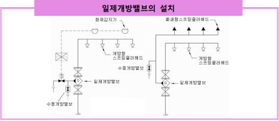 3. 일제개방밸브의 설치위치 일제개방밸브의 설치위치는 당해 방수구역외의 인접한 부근 또는 당해 방수구역 내에 설치하며 제6조 제2호의 해설(유수검지장치의 설치위치)를 준용한다. 가. 개방형스프링클러설비의 종류 일제개방밸브의 개방에 의하여 설치된 개방형스프링클러헤드에서 동시에 방수되는 설비로서 일제개방밸브의 제어에는 자동화재 감지장치 또는 화재감지용 스프링클러헤드(폐쇄형스프링클러헤드)와 연동하여 밸브가 열려 방수되는 자동식과 직접 수동기동밸브를 열어 밸브를 개방하는 수동식으로 구분한다. 1) 자동식기동개방 일제개방밸브의 작동이 전자밸브(솔레노이드밸브)에 의하거나, 폐쇄형스프링클러헤드(감지용 헤드)에 의한 자동기동 방식을 말한다. 전원 이상 등 비 상시를 대비하여 수동기동밸브를 함께 설치한다.