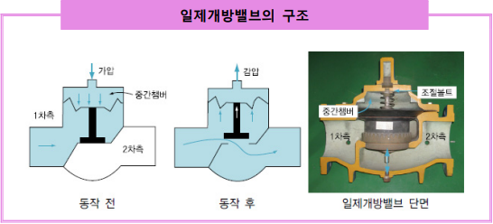 나. 일제개방밸브의 구조 일제개방밸브는 1차측과 밸브 본체내의 다이아프램실에 채워진 가압수의 압력균형으로 다이아프램이 닫힌 상태를 유지하다가 화재감지기 또는 수동개 방밸브의 조작으로 다이아프램실의 가압수가 배수되면서 압력균형이 깨져 밸브가 개방된다. 일제개방밸브의 2차측에 연결되는 배관에는 개방형스프링클러헤드, 물분무헤드 등을 설치한다. 밸브의 사용압력은 1㎫(10 ㎏/㎠), 1.6 ㎫(16㎏/㎠), 2㎫(20㎏/㎠)가 있으며, 호칭에 따라서는 50, 65, 80, 100, 150, 200로 구분된다. 밸브의 재질은 본체가 회주철, 고온고압용주강, 시이트 등은 청동주물과 동등이상의 재질로서 내식성이 있는 것이 사용되고 있다.