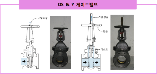 가. OS&Y 게이트(나사부 돌출형 게이트밸브) 밸브 밸브 디스크가 유체의 통로를 수직으로 막아서 개폐하고 유체의 흐름이 일직선 위에 있는 밸브이다. 밸브가 열려 있으면 그림과 같이 나사부가 돌출되어 쉽게 확인이 가능하다. 닫혀 있는 경우는 나사부가 밸브본체 속으로 매몰된다. 이는 소화배관 상에 밸브가 폐쇄됨으로 인하여 발생할 수 있는 송수불능의 사태를 막기 위한 것이며, 항상 육안으로 밸브의 개폐상태를 쉽게 점검하기 할 수 있다.
