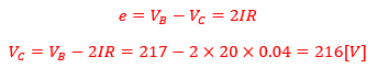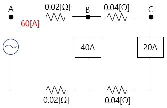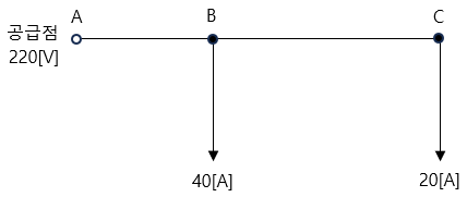 그림과 같은 단상 2선식 회로에서 공급점 A의 전압이 220[V]이고, A-B 사이의 1선마다의 저항이 0.02[Ω], B-C 사이의 1선마다의 저항이 0.04[Ω]이라 하면, 40[A]를 소비하는 B점의 전압 VB와 20[A]를 소비하는 C점의 전압 VC를 구하시오. (단, 부하의 역률은 1이다.)
