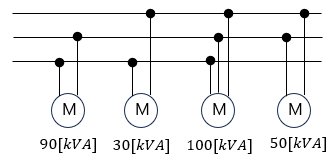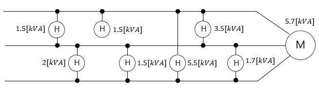(3)부하 설비가 그림과 같을 때 설비 불평형률을 몇 [%]인가?(단, H는 전열기 부하이고, M은 전동기 부하이다.)