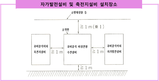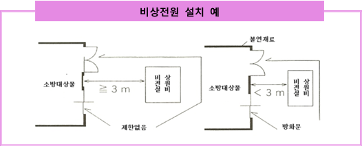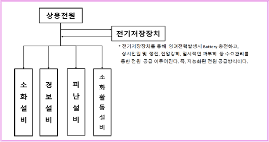 2. 비상전원의 종류를 자가발전설비인 발전기(일반적으로 디젤엔진을 사용한다) 또는 축전지설비(전기저장장치)로 제한하는 기준이다.