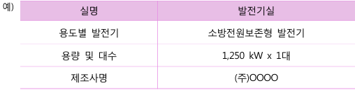 3. 자가발전설비의 부하용도별 표지부착 비상전원실 출입구 부근 외부에는 비상전원 종류별 실명과 용도별 기종 명칭, 정격출력용량, 제조사명을 기재한 표지를 부착하여야 한다.