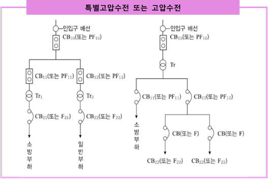 2.9.1.2 특별고압수전 또는 고압수전일 경우에는 전력용 변압기 2차 측의 주차단기 1차 측에서 분기하여 전용배선으로 하되, 상용전원의 상시공급에 지장이 없을 경우에는 주차단기 2차측에서 분기하여 전용배선으로 할 것. 다만, 가압송수장치의 정격입력전압이 수전전압과 같은 경우에는 2.9.1.1의 기준에 따른다.