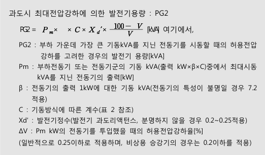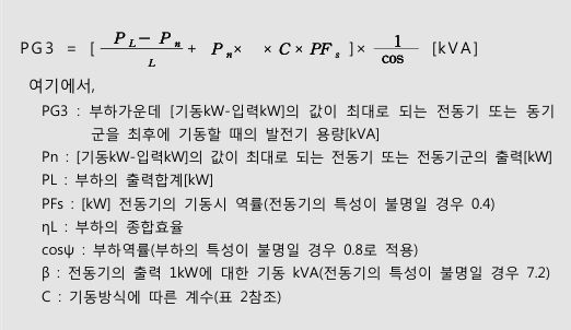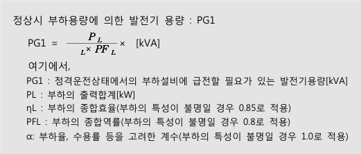 비상발전기 출력용량 산정 비상발전기의 출력용량 산정은 자가발전설비에 연결되는 전력시설의 대상 부하 용량을 기준으로 하여 산정한다. 그 산정 방식에는 PG방식 또는 RG방식이 있으 며, 건축전기설비설계기준(2016년 국가건설기준코드 KDS 31 60 20)에 그 공식이 제시되어 있다. PG방식에 의한 발전기용량 계산방식을 예로 들면 다음과 같다.
