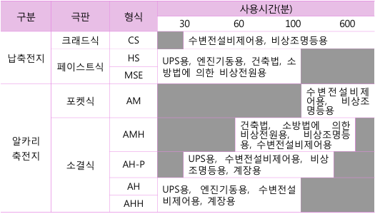5. 엔진구동 소화펌프 5시간 방전율 강하다 짧다 우수하다 30년 이상 비싸다 약간 작은 편이다 엔진구동 소화펌프는 화재 시 전원에 의하지 않고 소화펌프를 구동시킬 수 있는 장치로서 소규모(7층 이상으로서 2,000㎡ 이상 또는 지하층으로서 바닥면적의 합 계가 3,000㎡ 이상의 건축물에 해당되지 않는 건축물)의 옥내소화전설비의 소방펌 프의 안전 강화를 위한 보완설비용 또는 고가수조 설치 면제에 대한 보완시설로 서의 예비펌프용으로 사용할 수 있다. 소규모 대상 건축물에서 수전설비 용량을 감소시키기 위해 엔진 구동 소화펌프를 사용하는 것은 유지관리 측면에서 성능 확보가 어려운 취약점으로 인해 바람직하지 않다. 2014년 원자력발전을 통한 전력생산량이 약40%의 비율을 차지하고 있으며 원 자력발전의 경우 임의로 전력생산량을 조절 못하는 구조로 일정시간동안 정지 후 재가동이 매우 어려워 전력생산은 항상 일정한 용량이상을 발전해야 하는 상황이 다. 이러한 상황에서 일반적으로 주간에 비해 야간에는 소모전력이 적어 이를 활 용하고자 과잉생산 된 전력을 저장했다가 전력부족이 발생하면 송전해주기 위한 장치로 전기저장장치가 개발되었다. 또한, 환경보호와 천연자원 고갈문제의 해결을 위해 최근 이슈화되는 신재생에 너지는 환경에 따라 발전량이 달라져서 출력이 불안정할 수 밖에 없는 구조이다. 신재생에너지의 경우 전기저장장치를 이용할 경우 전기저장장치 내의 전기축적을 통해 출력하게 되어 출력을 안정화 시킬 수 있는 장점을 가지게 된다. 또한, 정전 및 화재로 인한 상용전원 차단 시에도 전기저장장치를 통한 전기 공급이 가능하 므로 2016. 7. 13. 화재안전기준 개정을 통해 전기저장장치를 비상전원으로 인정 하였다. 전기저장장치(ESS,. Energy Storage System)의 전기저장방식으로는 리튬이온전지(LIB), 나트륨황전지(NaS), 레독스흐름전지(RFB), 압축공기저장 시스템(CAFS) 등이 있다. 또한, 사용되는 축전지의 종류에 의한 사용시간에 대한 사항은 다음의 표와 같다.