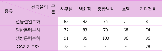 1. 소방부하와 비상부하의 구분 개정된 화재안전기준에 의하면 소방부하와 비상부하를 구분하고 있다. 가. 소방부하 : 화재 시 인명 보호를 위한 전력부하로서 「소방시설 설치유지 및 안전관리에 관한 법률」시행령 [별표 1]에 의한 소방시설(소화설비, 피난설비, 소화용수설비, 소화활동설비 등) 및 건축법령에 의한 방화·피난시설(비상용승 강기, 피난용승강기, 피난구조명등, 배연설비, 방화문, 방화셔터 등)이다. 의 료법령에 의한 의료시설 및 소방시설 작동으로 침수 우려가 있는 지하의 기 계실 등에 시설된 배수펌프도 포함된다. 나. 비상부하 : 소방부하 이외의 비상용 전력부하로서 항온항습시설, 비상급수펌 프, 보안시설, 급기팬, 배기팬, 냉장·냉동시설, 공용전등전열, 승용승강기, 비상용승강기, 급탕순환펌프, 주방동력, 기계식주차장동력, 정화조동력, 냉·난방시 설(난방용 보조전원장치), 동파방지시설 등이 있다. 비상부하에는 기준에 따 른 수용률이 적용되는 바 이의 적정성이 확보되지 않으면 소방전원 용량을 침해하여 과부하를 초래하므로 소방전원 상실이 초래되는 위험 조건이 된다. 다. 비상부하 수용률 : 비상부하에는 다음표의 수용률을 적용하여야한다. 1) 건축물의 기준 수용률(%)